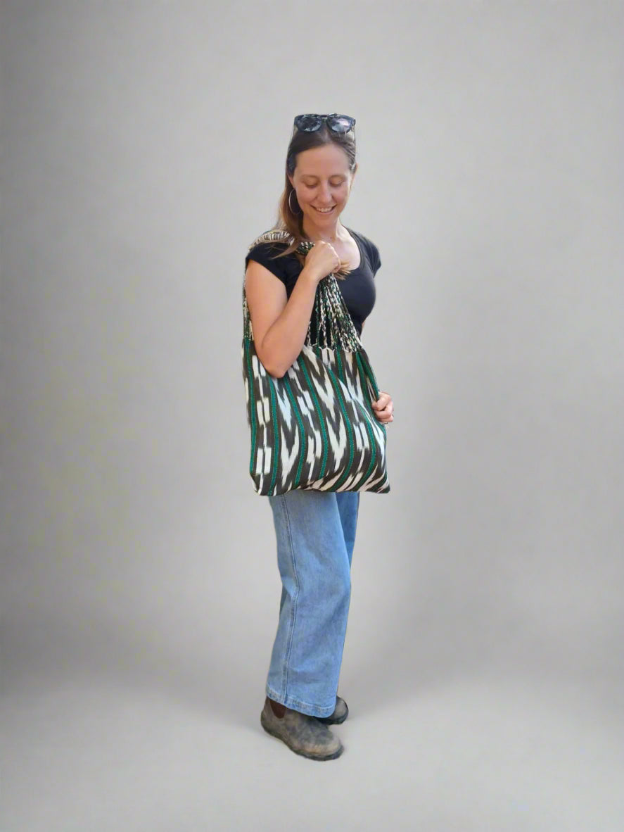 Upgrade your shopping trips and market strolls with this handwoven Jaspe tote bag, crafted with Mayan textile artistry. Designed in San Juan La Laguna, Lake Atitlán, this eco-friendly bag is made using the traditional Jaspe (Ikat) dyeing technique, where each thread is hand-dyed and woven on a backstrap loom, creating intricate geometric, animal, and floral patterns.