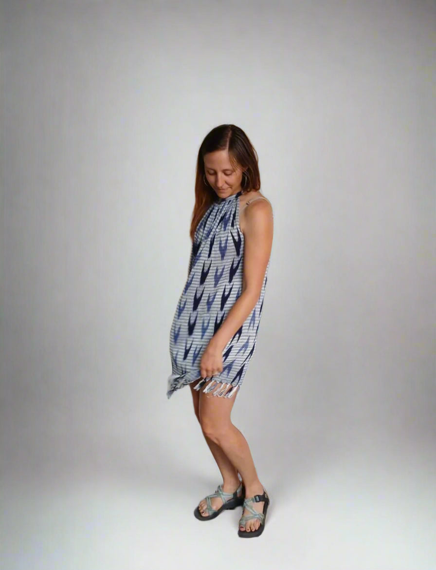 Stay cool, stylish, and effortlessly chic with this handwoven Jaspe mini dress, crafted for warm summer days and breezy evenings. Designed in San Juan La Laguna, Lake Atitlán, this lightweight and flowy halter dress is made using the traditional Jaspe (Ikat) dyeing technique, where each thread is hand-dyed and woven on a backstrap loom, revealing intricate geometric patterns that celebrate Mayan artistry and craftsmanship.