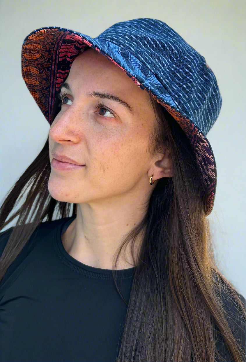 This upcycled bucket hat is crafted from authentic Maya cortes in rich indigo hues with vibrant interior accents. Handmade in Totonicapán, Guatemala, it’s designed for comfort, practicality, and conscious fashion lovers. Sustainable & Stylish.