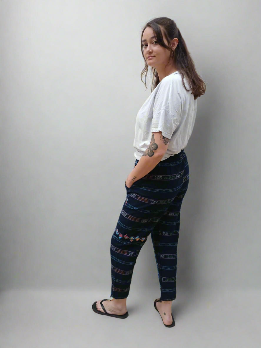 Step into style and comfort with our handwoven Guatemalan corte trousers, crafted by skilled Mayan weavers. Made from 100% upcycled Guatemalan cortes, these trousers offer a unique and vibrant design, blending tradition with contemporary fashion.